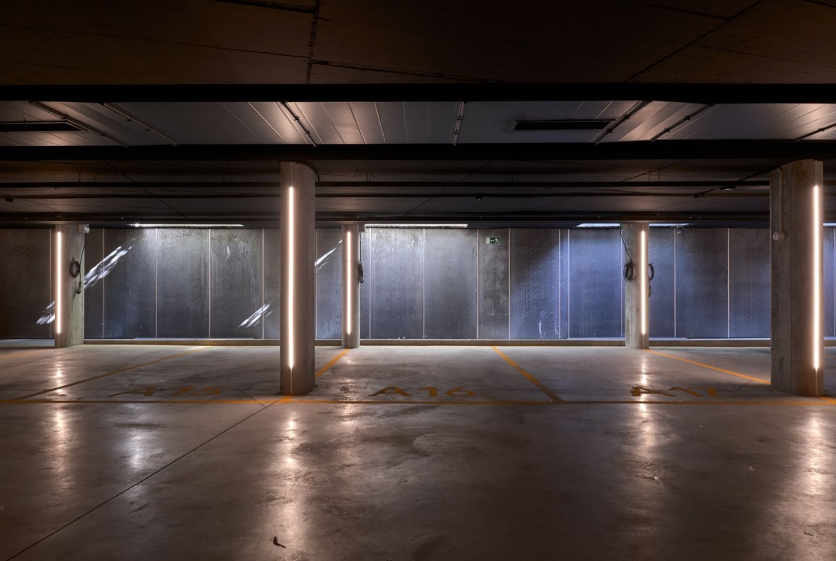 Dos plazas de garaje extra anchas con punto de carga para coche eléctrico incluidas en el precio y una tercera opcional.