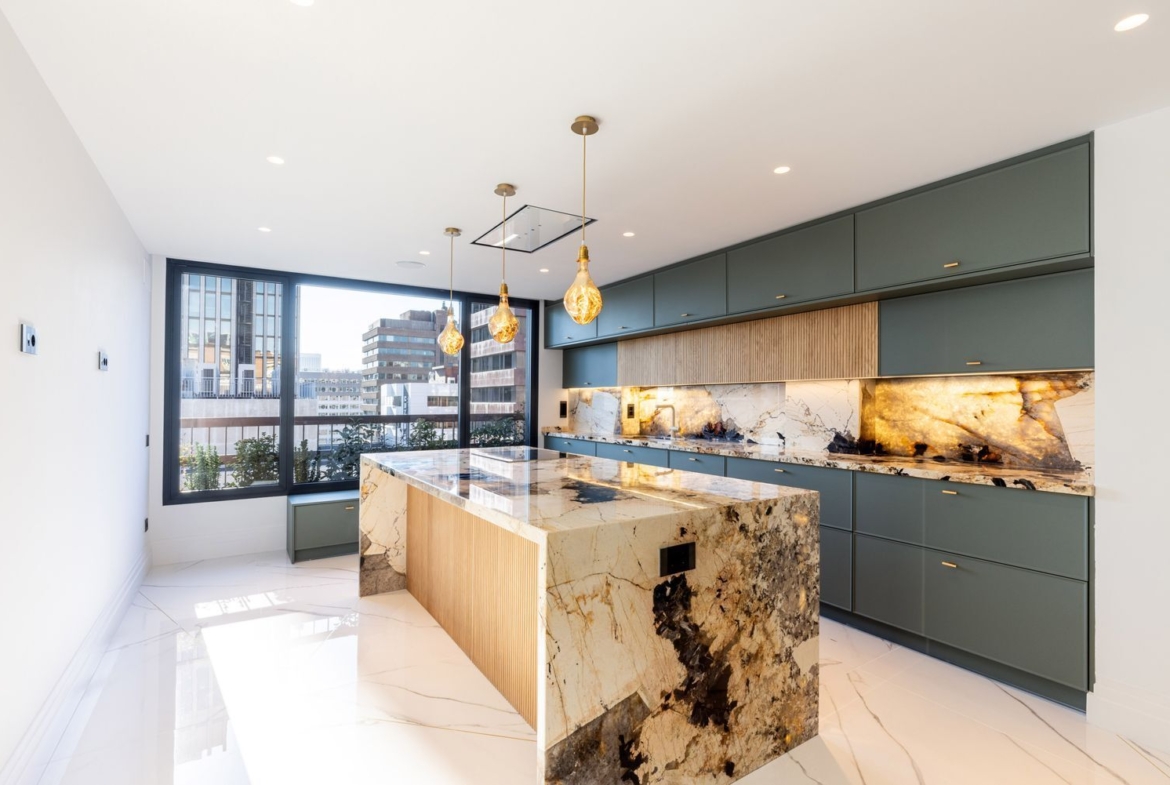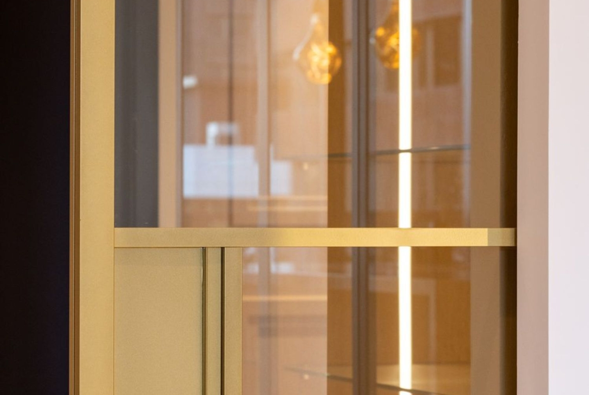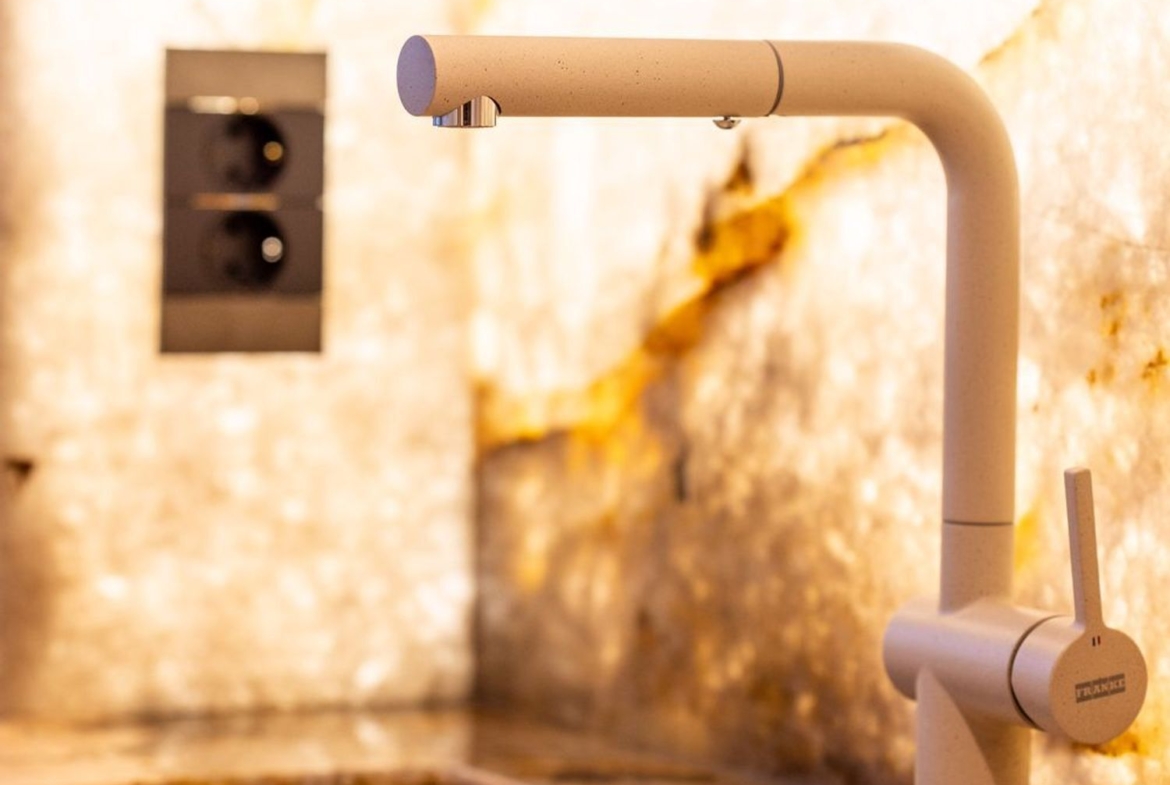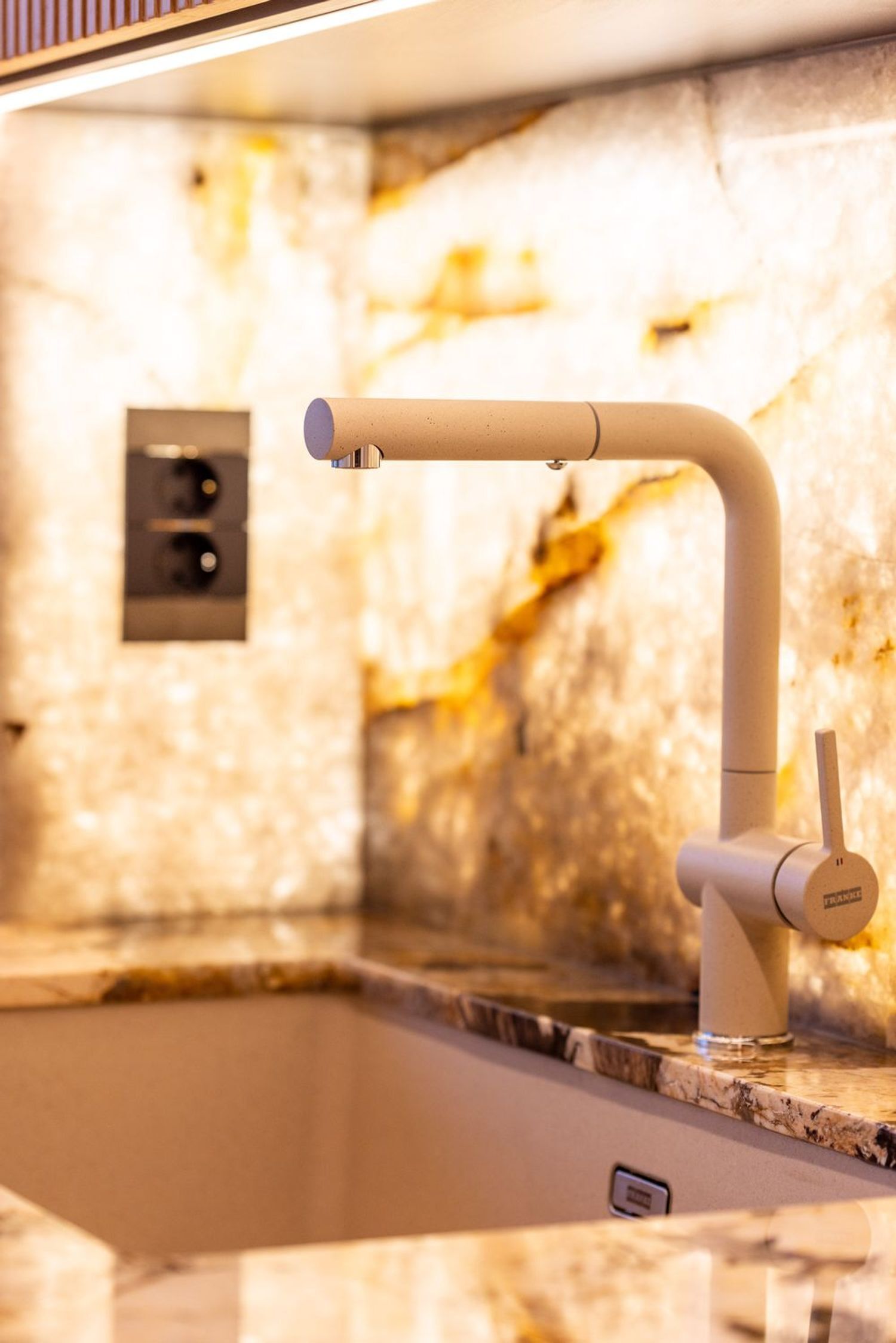 La cocina, fabricada por BC3, está equipada con electrodomésticos Siemens de alta gama, isla de cuarcita traslúcida retroiluminada y muebles de gran capacidad. Las puertas correderas de diseño exclusivo con cristal réflex ofrecen privacidad sin sacrificar luminosidad.