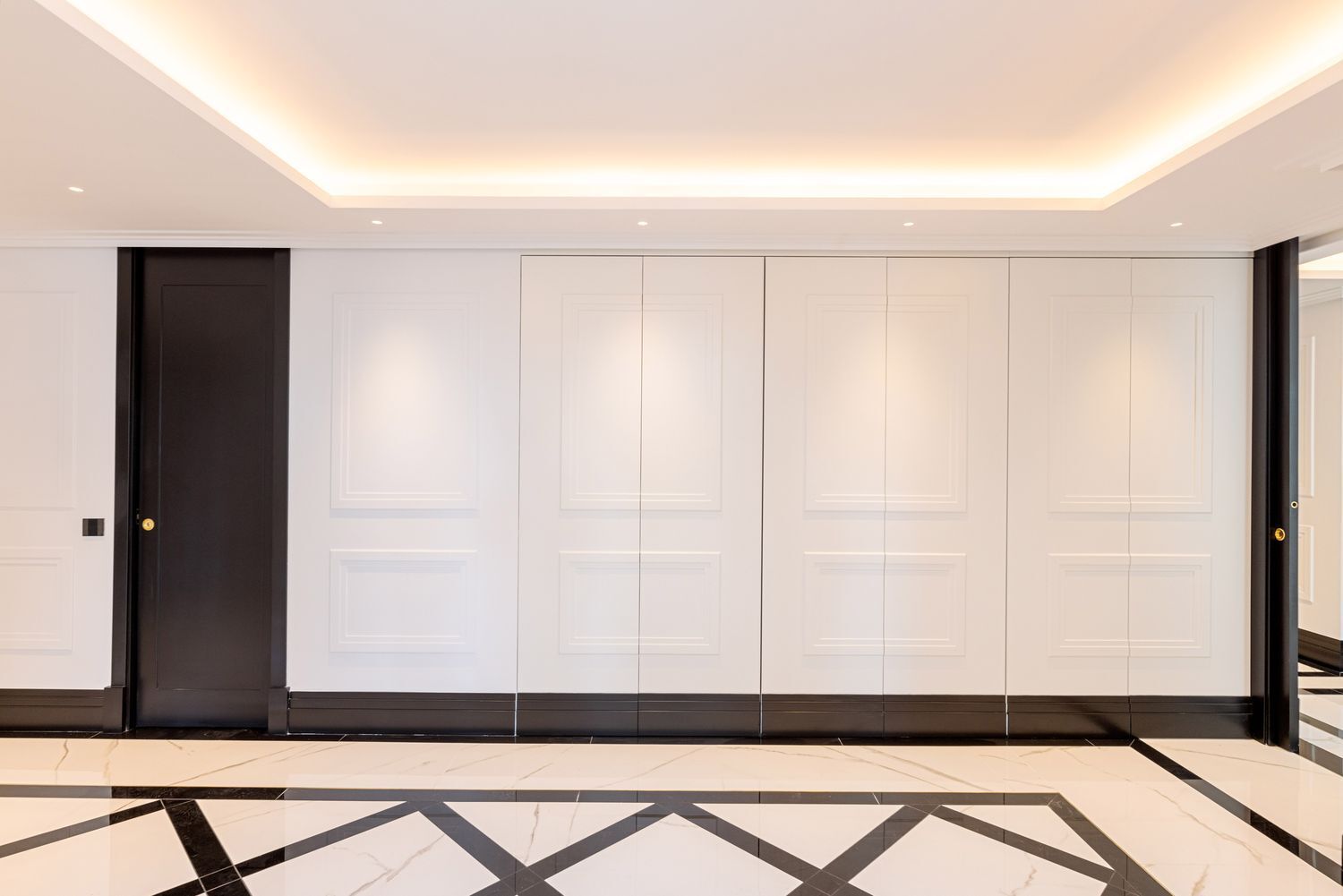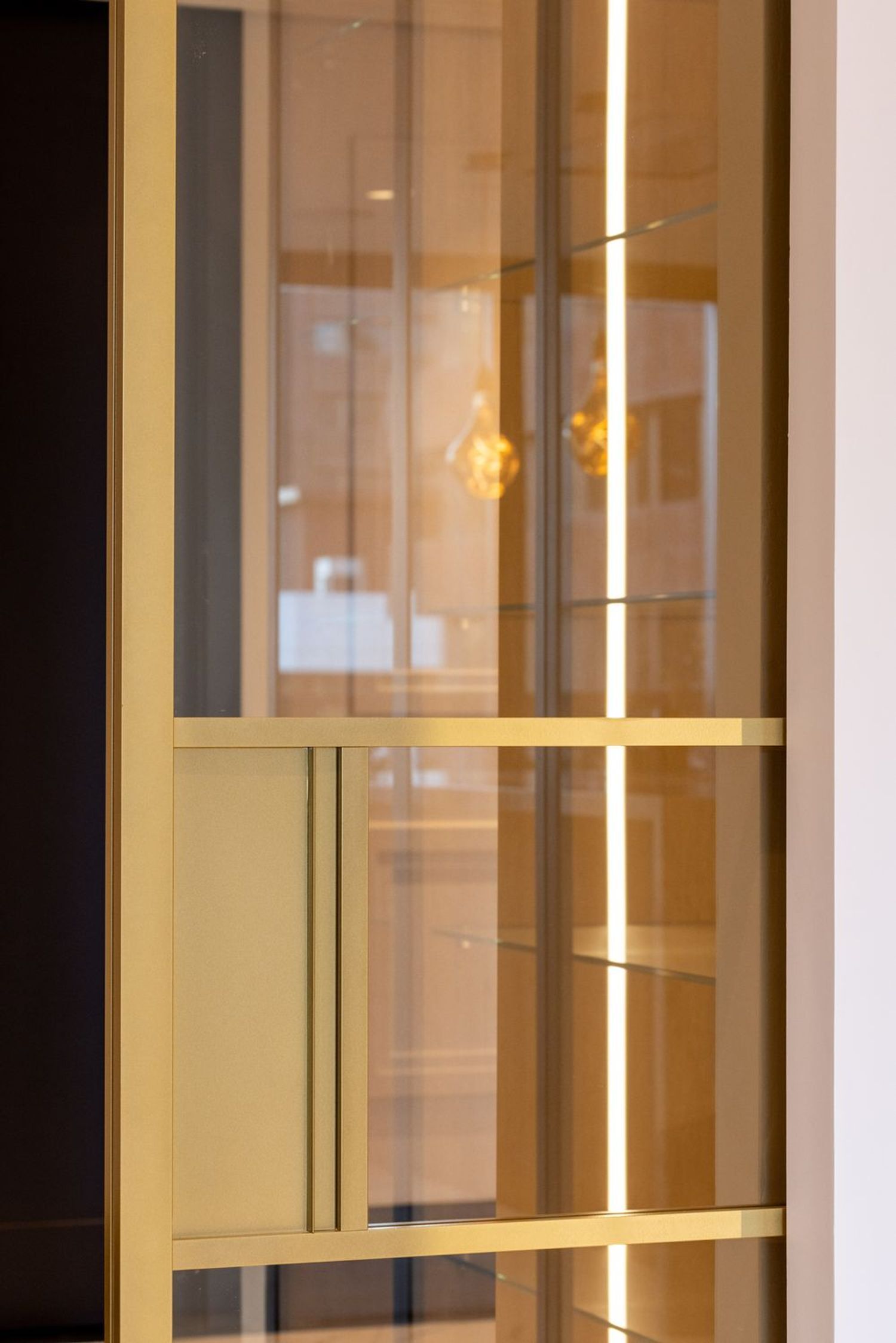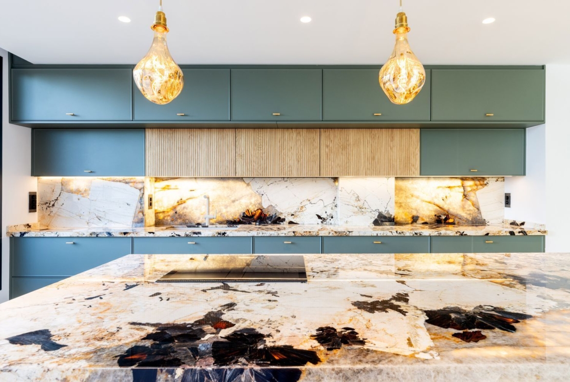 La cocina, fabricada por BC3, está equipada con electrodomésticos Siemens de alta gama, isla de cuarcita traslúcida retroiluminada y muebles de gran capacidad. Las puertas correderas de diseño exclusivo con cristal réflex ofrecen privacidad sin sacrificar luminosidad.