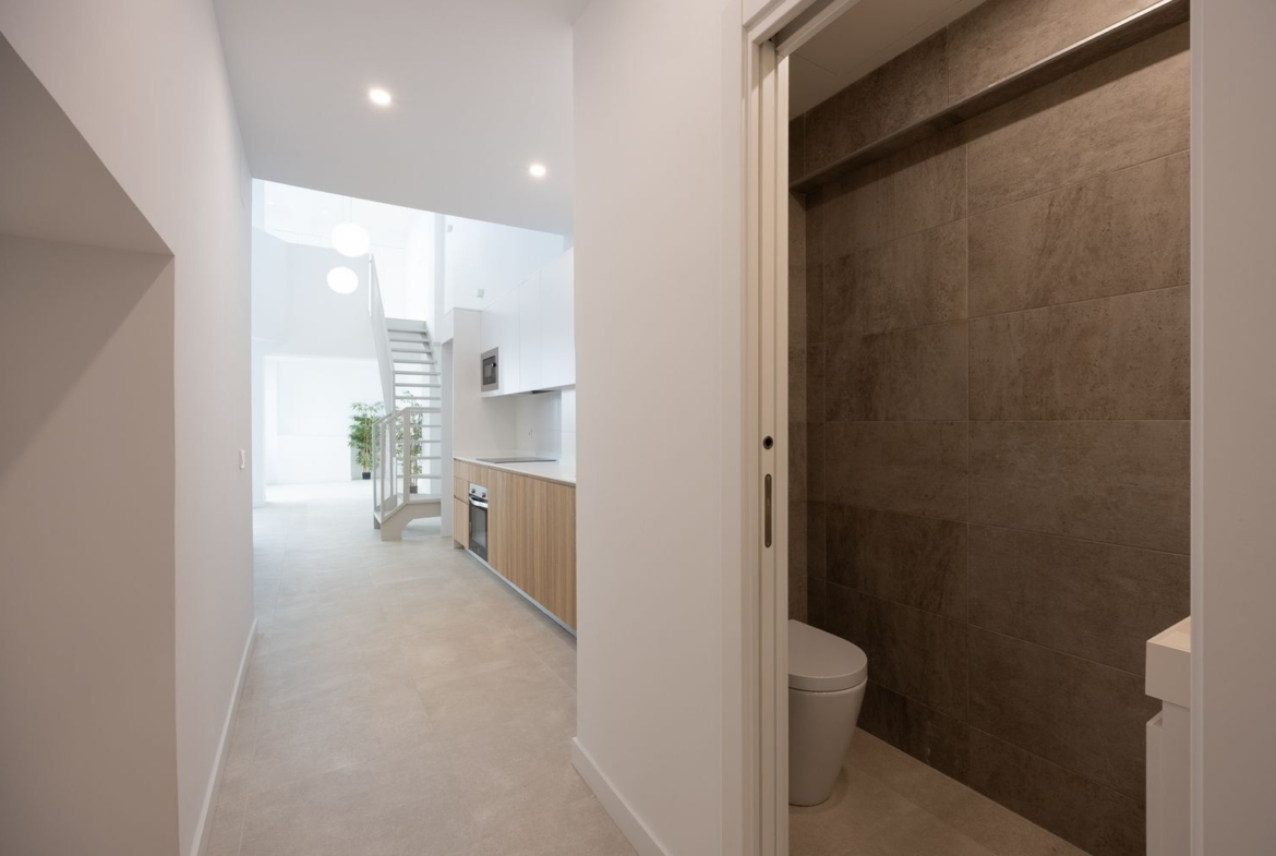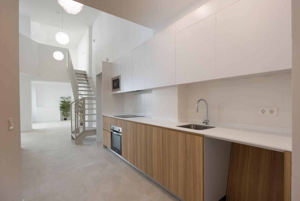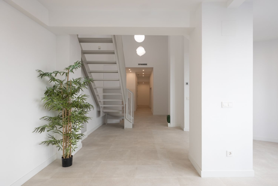 Las 5 viviendas cuentan con su propio portal de acceso desde la calle, moderno y funcional, lo que las dota de una gran exclusividad y privacidad con respecto al resto del edificio. Todas son de tipo dúplex, con un diseño singular que las hace únicas. La planta baja se destina a recibidor, distribuidor, gran espacio abierto para salón ? comedor y cocina, con muchísima luz natural, baño o aseo y cuarto para instalaciones y lavandería. En la planta alta se ubica el dormitorio y el baño propio (no en todas las unidades), sin ocupar todo el espacio, de forma que con el juego de volúmenes se consiguen techos muy altos y una excelente distribución de la luz y el espacio entre ambas plantas. Las escaleras gozan de tiro amplio, cómodo, abierto y están fabricadas a medida de cada dúplex en una sola pieza metálica, perfectamente integrada en el diseño de cada vivienda.