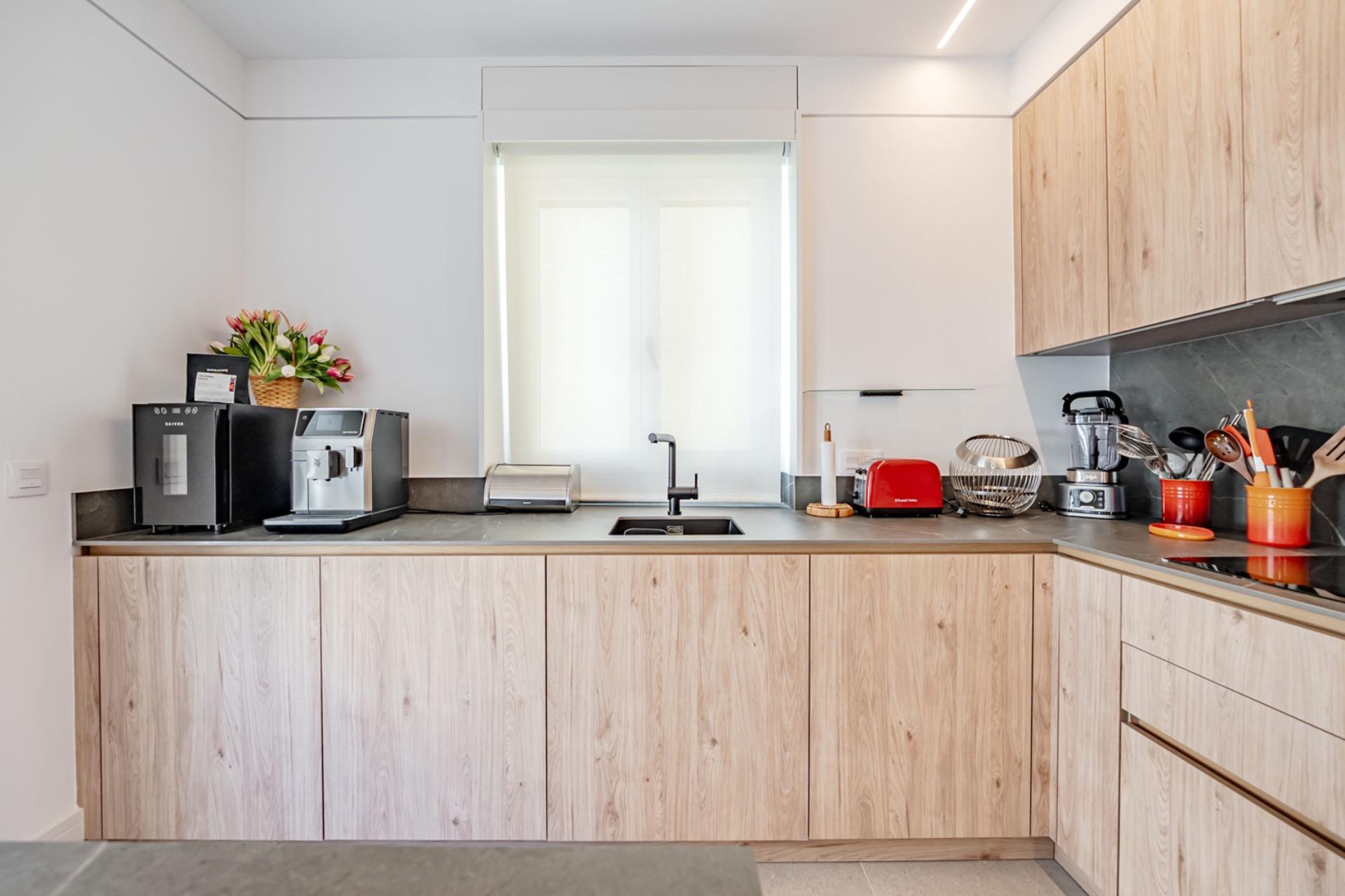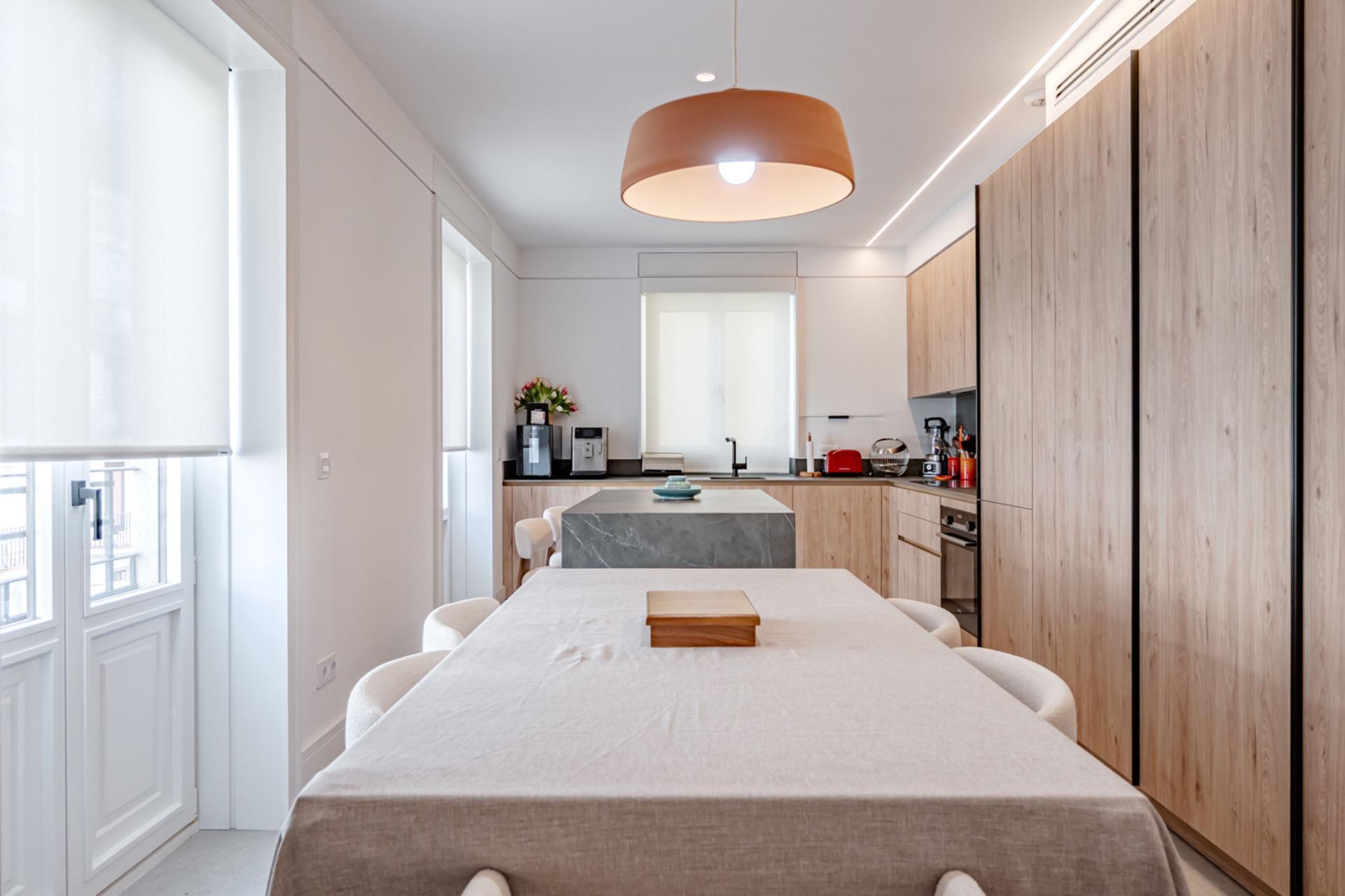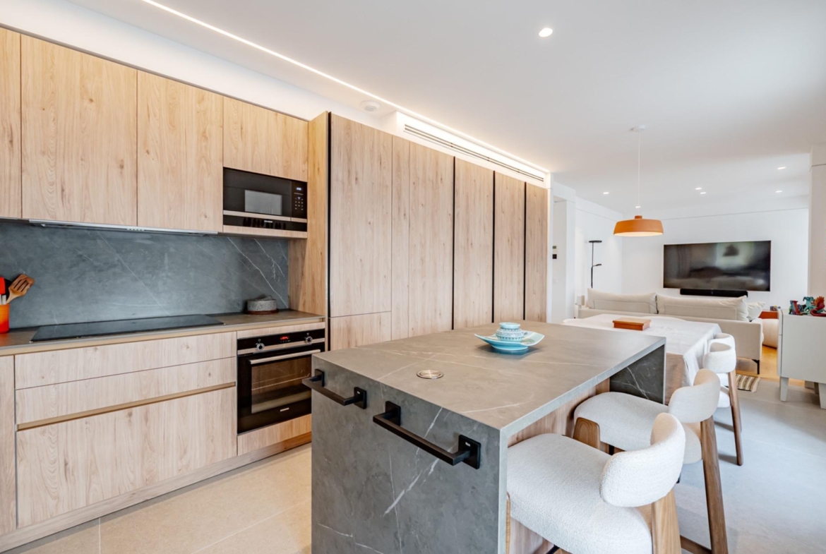 El interior ha sido diseñado con un concepto moderno y funcional, destacando una cocina americana totalmente equipada, integrada en un gran salón-comedor, creando un espacio continuo y luminoso con cuatro ventanales al exterior.