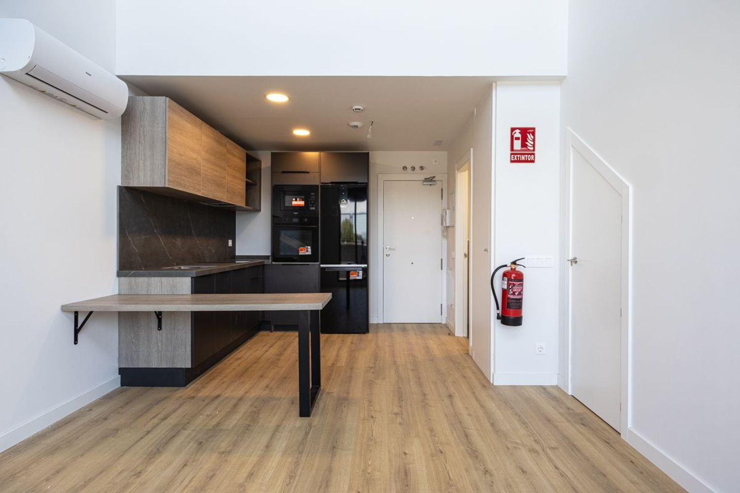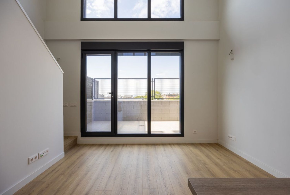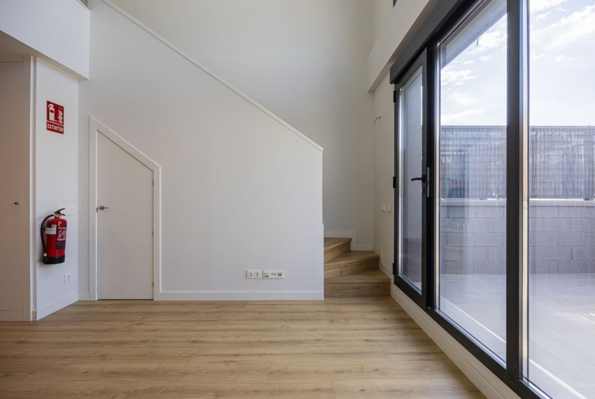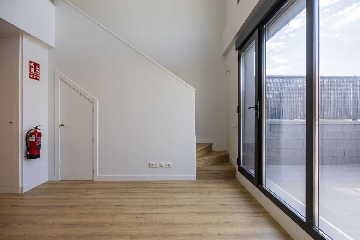 Accedemos desde la planta baja a un espacio diáfano y luminoso dotado de cocina abierta y totalmente equipada con electrodomésticos de alta gama, un aseo, un armario empotrado y un pequeño y útil trastero ubicado en el hueco que deja la escalera de acceso al espacio de la segunda planta, además de la estupenda terraza con orientación sudoeste.