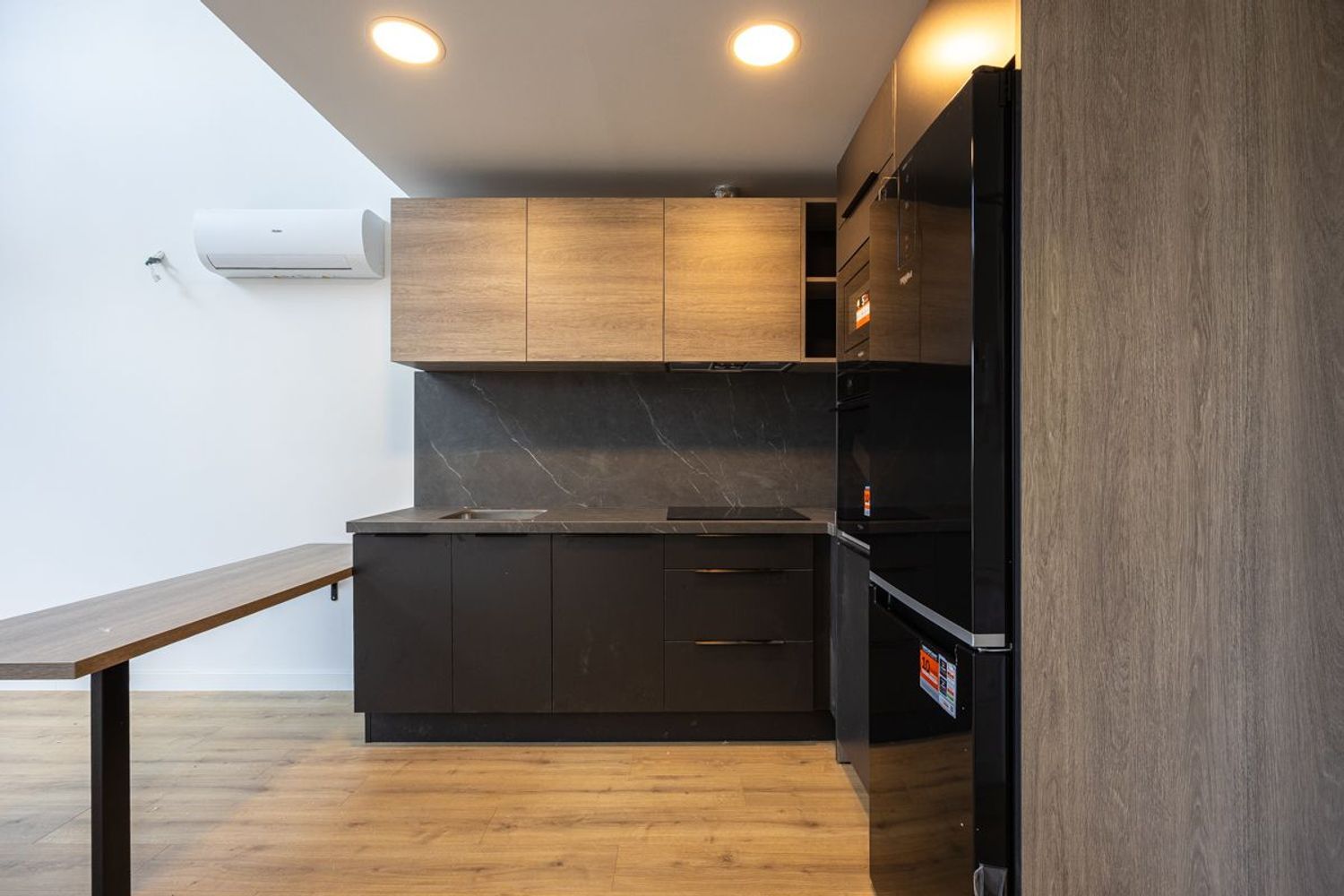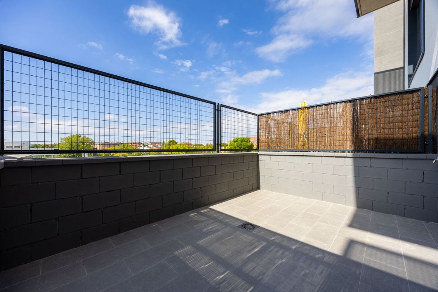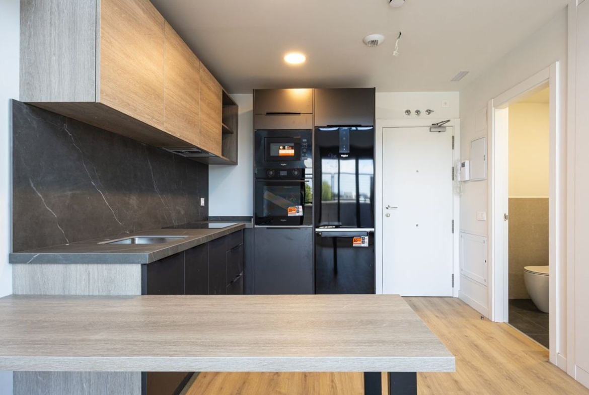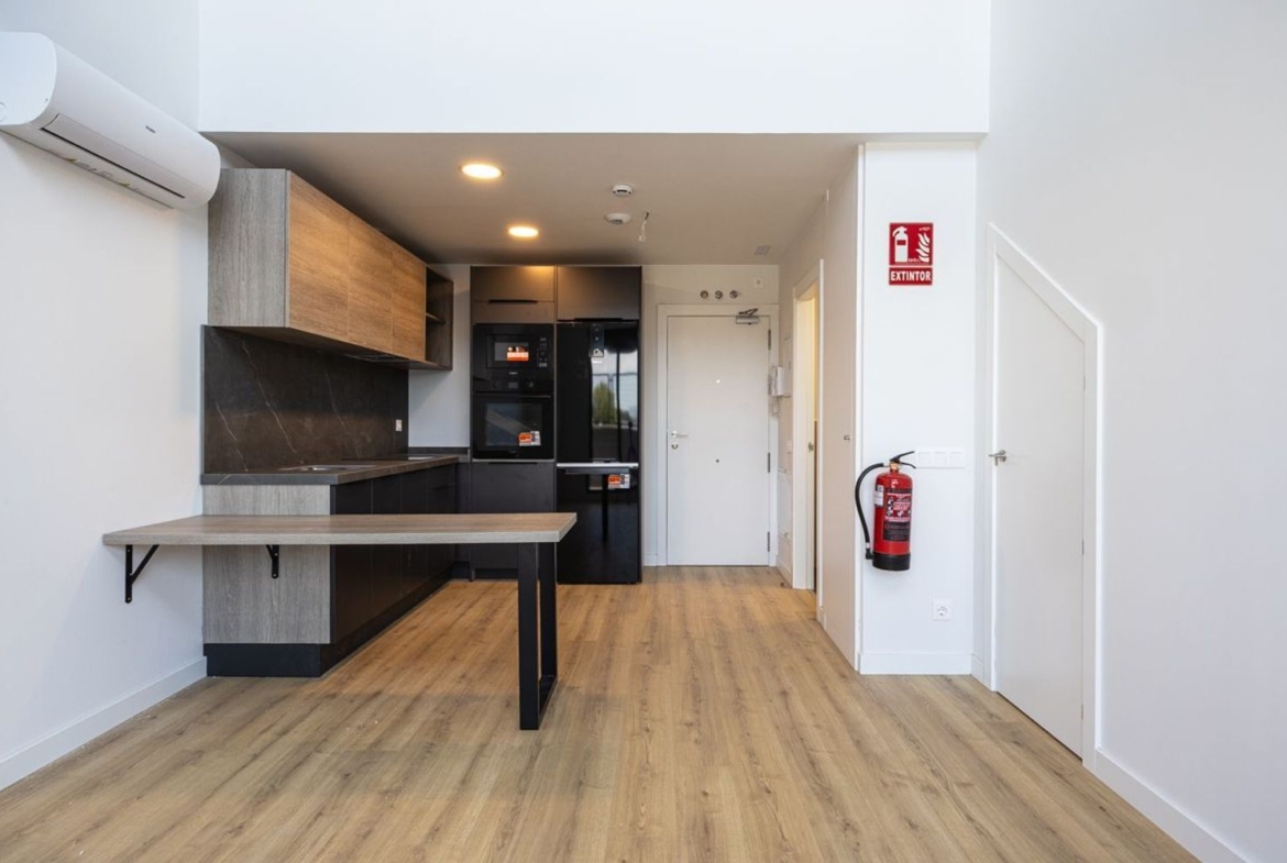 Accedemos desde la planta baja a un espacio diáfano y luminoso dotado de cocina abierta y totalmente equipada con electrodomésticos de alta gama, un aseo, un armario empotrado y un pequeño y útil trastero ubicado en el hueco que deja la escalera de acceso al espacio de la segunda planta, además de la estupenda terraza con orientación sudoeste.