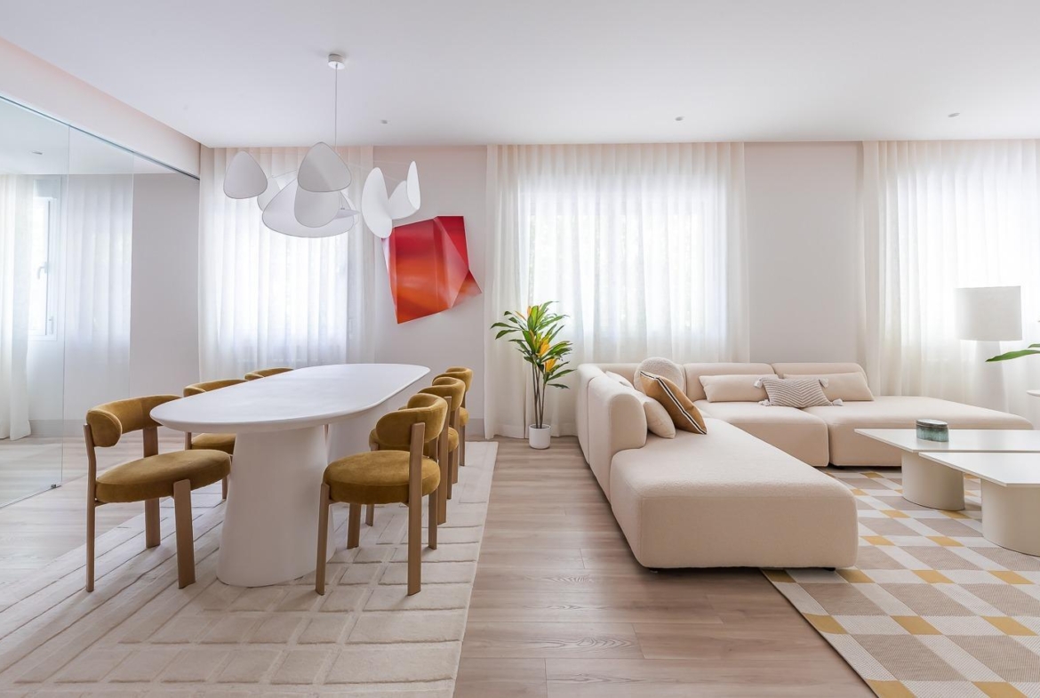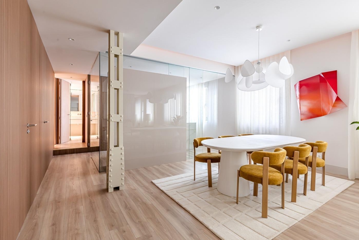 La vivienda, de 125 metros cuadrados, ha sido reformada con un diseño contemporáneo y materiales de altísima calidad. Sus tres elegantes habitaciones en suite, dos de ellas con su propio baño privado, ofrecen el máximo confort y privacidad. La distribución es inteligente y funcional, con espacios amplios, luminosos y perfectamente aprovechados. Al entrar tenemos un amplio salón comedor y una cocina totalmente equipada y separada con cristal. Por el lado izquierdo discurre un pasillo que distribuye primero un baño y la primera habitación, este baño hace también la función de aseo de cortesía al estar separado de la habitación. Siguiendo por el pasillo encontramos otra habitación con baño privado y la habitación principal al fondo también con baño en suite. Los acabados de lujo, los suelos de madera natural, la cocina de diseño y la cuidada iluminación hacen de esta propiedad un auténtico oasis urbano para quienes buscan estilo, calidad y bienestar.