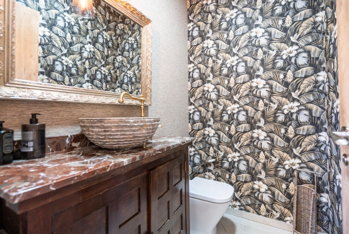 El palacete principal refleja un marcado carácter señorial y exclusivo, con 6 dormitorios y 4 baños, un amplio salón comedor con chimenea, gran porche acristalado con cerramientos aislantes y calefacción, cocina doble y buhardilla destinada a trastero y lavandería. La vivienda principal cuenta además con calefacción por suelo radiante mediante aerotermia, proporcionando un confort térmico superior y una alta eficiencia energética, acorde con una propiedad de lujo.