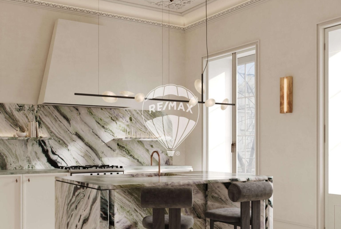 La esencia de esta propiedad reside en la combinación de elementos preexistentes, como las cornisas y las puertas clásicas, con materiales contemporáneos para crear un espacio único y lleno de carácter.
