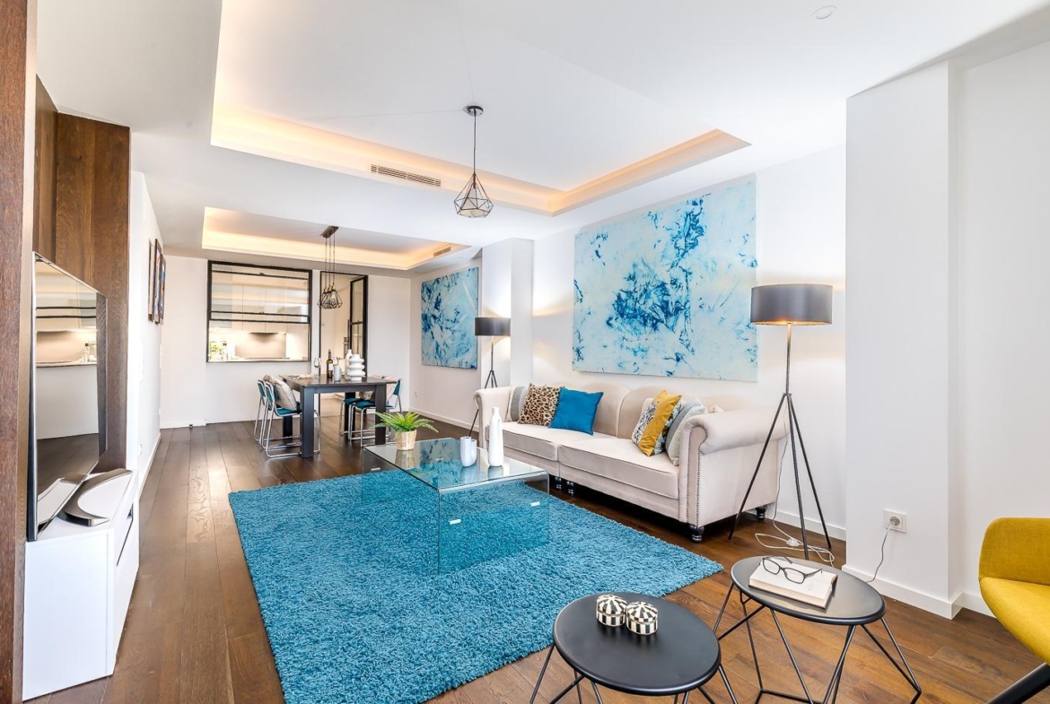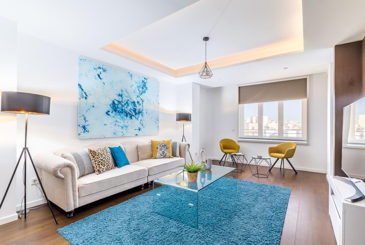 Este piso de dos habitaciones en la octava planta de un edificio en las cercanías de Plaza España se distribuye: al entrar con un amplio hall alargado en el que tenemos un armario empotrado de gran capacidad, a la izquierda una puerta nos lleva al dormitorio secundario con baño incorporado en suite, a la derecha el dormitorio principal también con baño incluido y zona de vestidor, desde el hall de frente accedemos al salón-comedor con cocina totalmente equipada con electrodomésticos marca premium separada con una cristalera. El piso es exterior y esta a una buena altura lo que le confiere gran luminosidad.