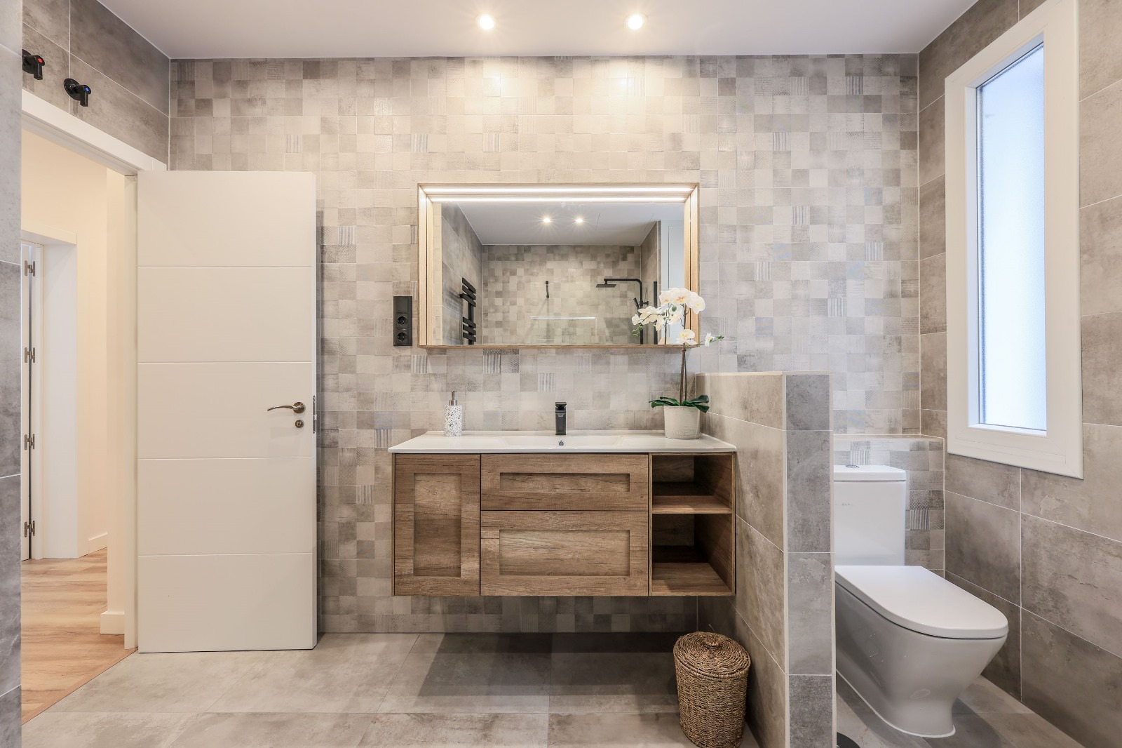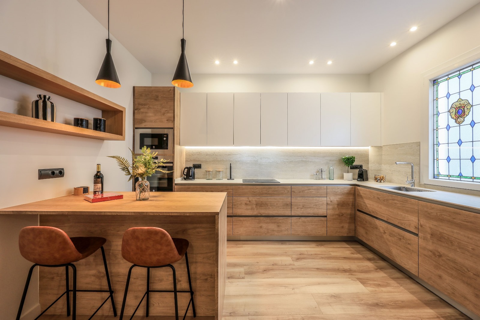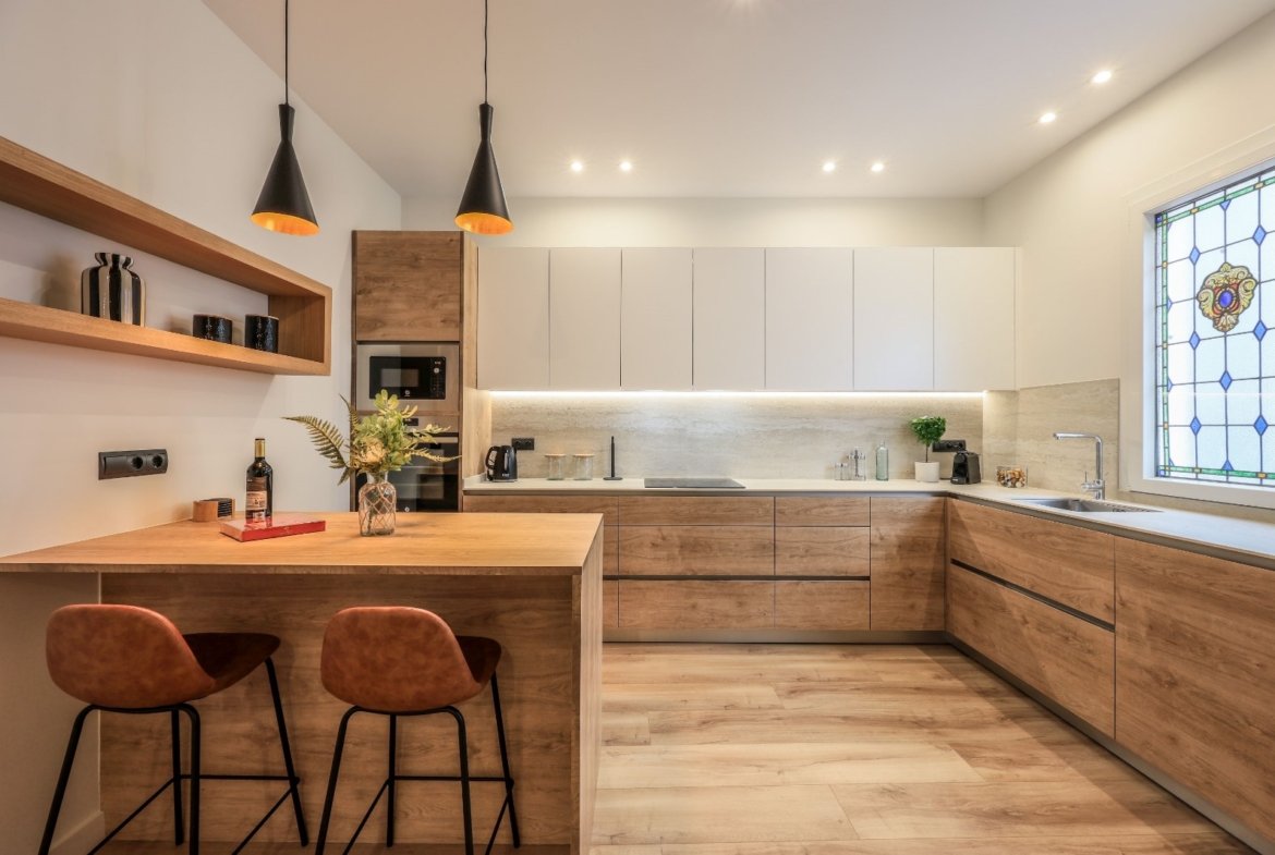 Tarima flotante en dormitorios, pasillos,  salón, comedor y cocina AC5, grifería monomando de alta gama, lacada en negro