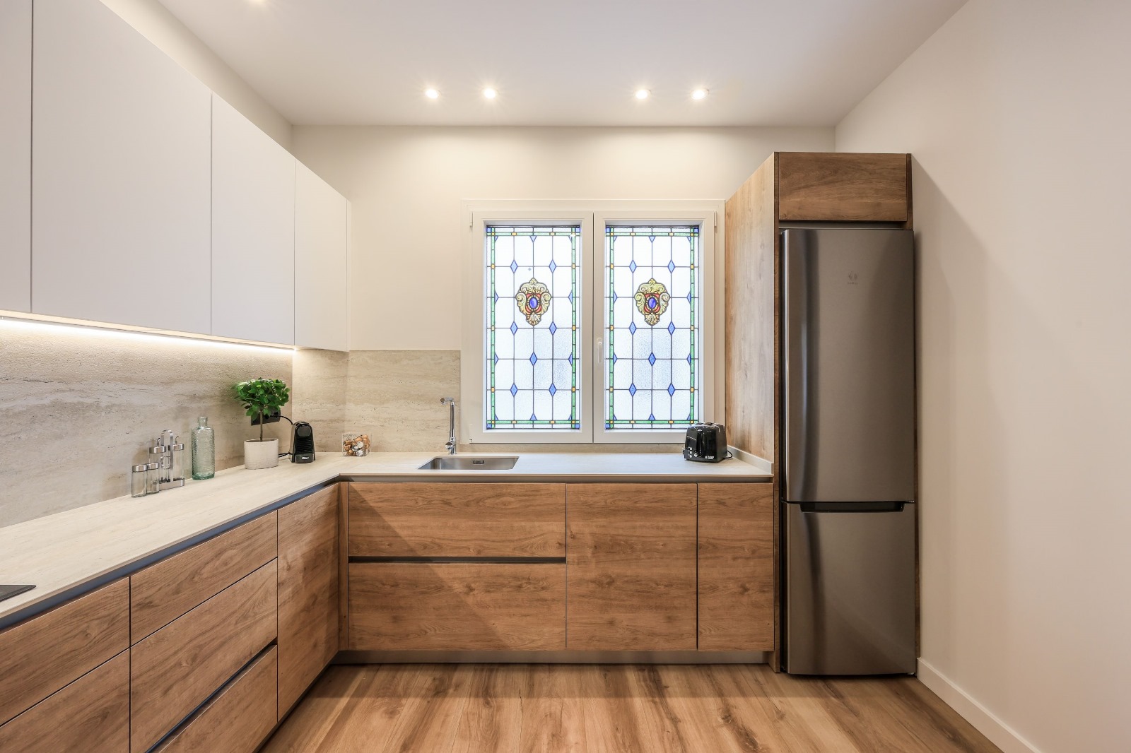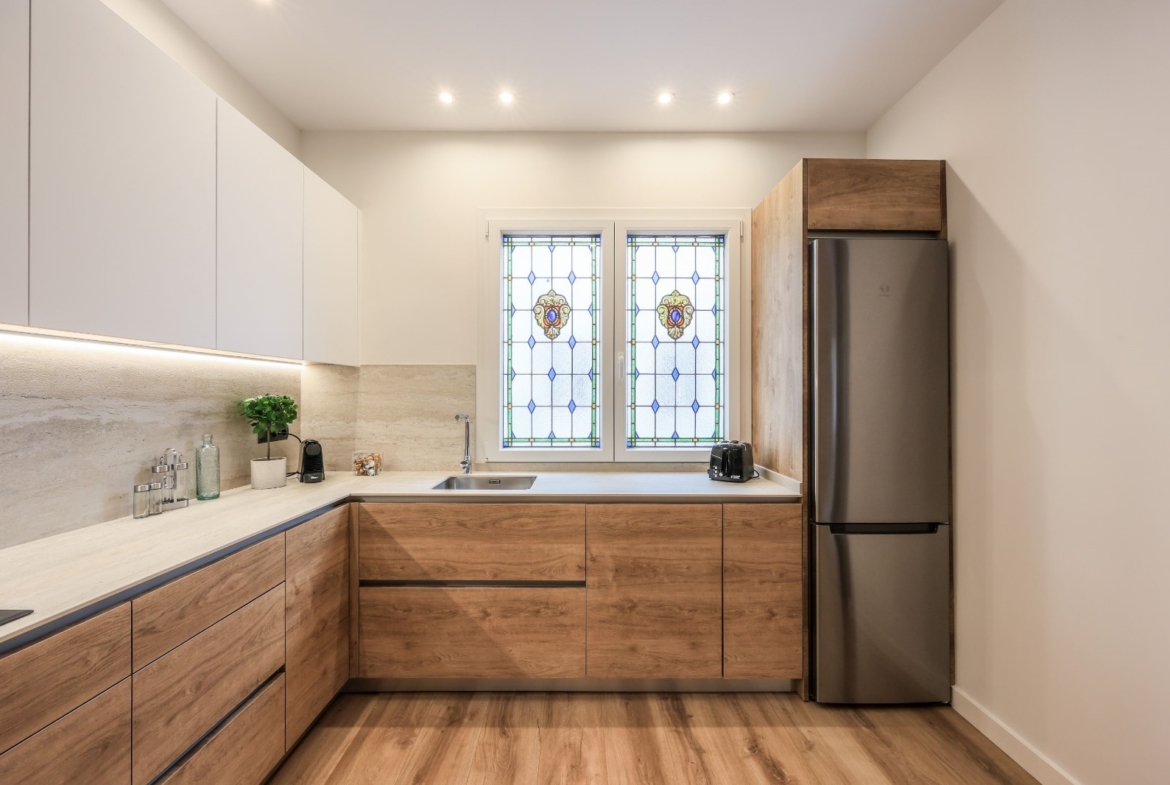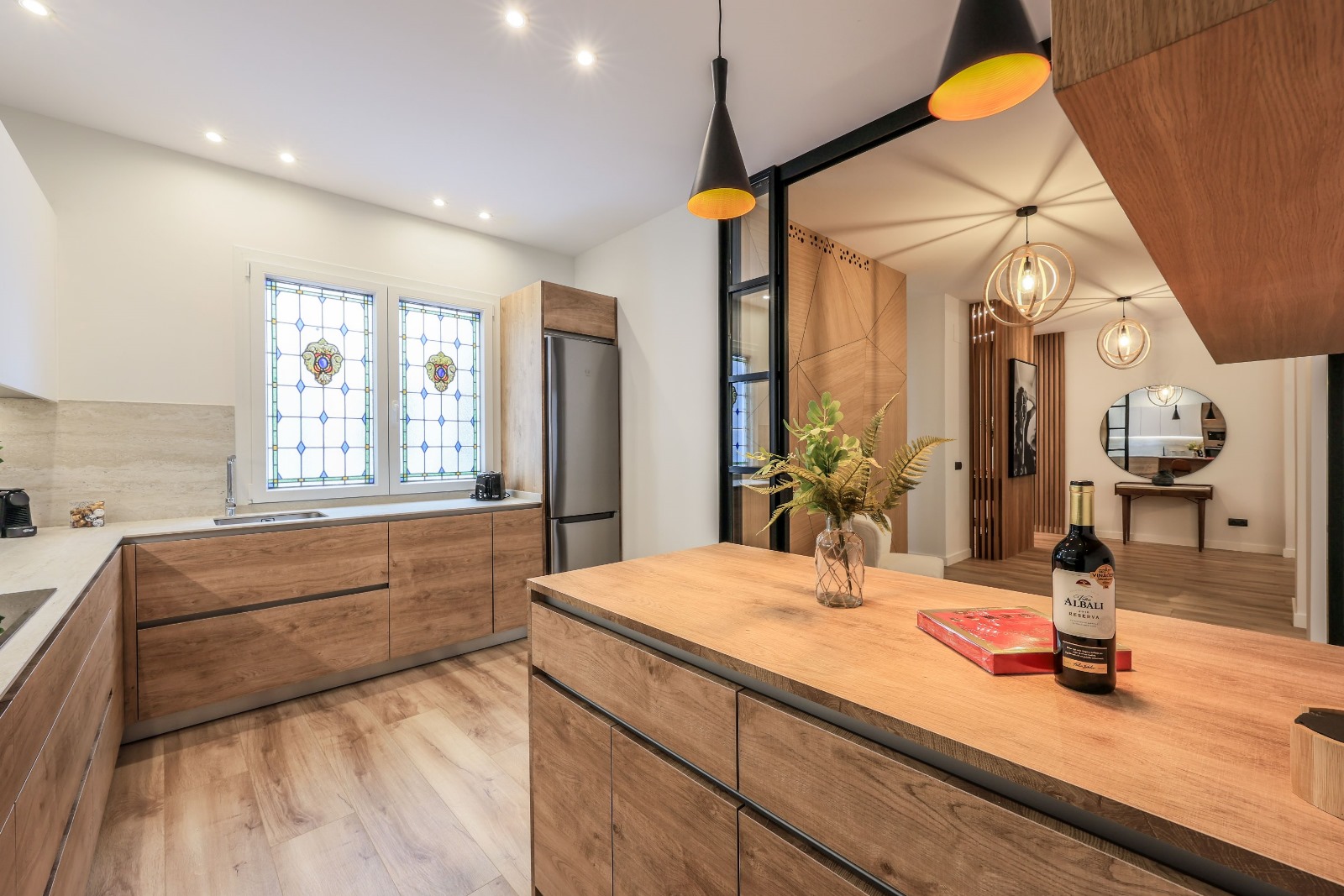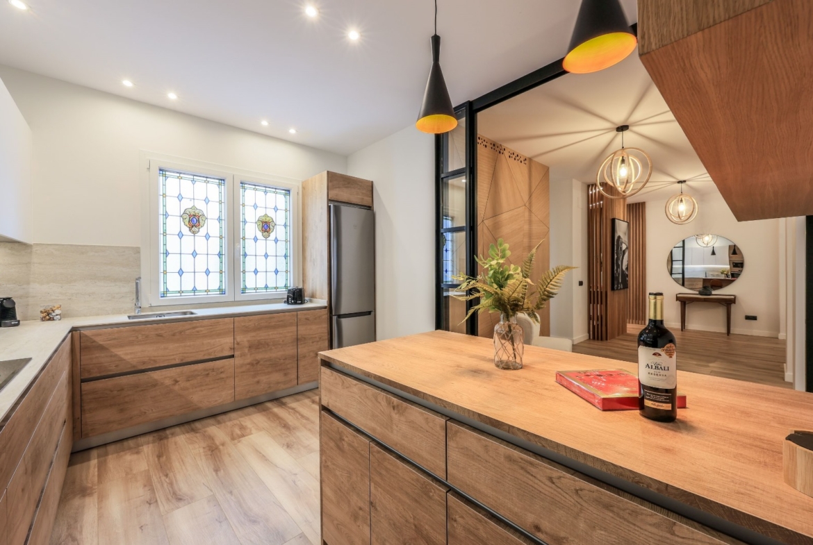 Cocina con electrodomésticos de alta gama, tiene una cristalera corredera que permite tanto integrarla al salón, como independizarla.