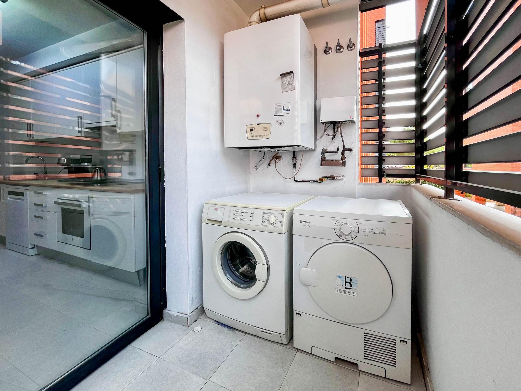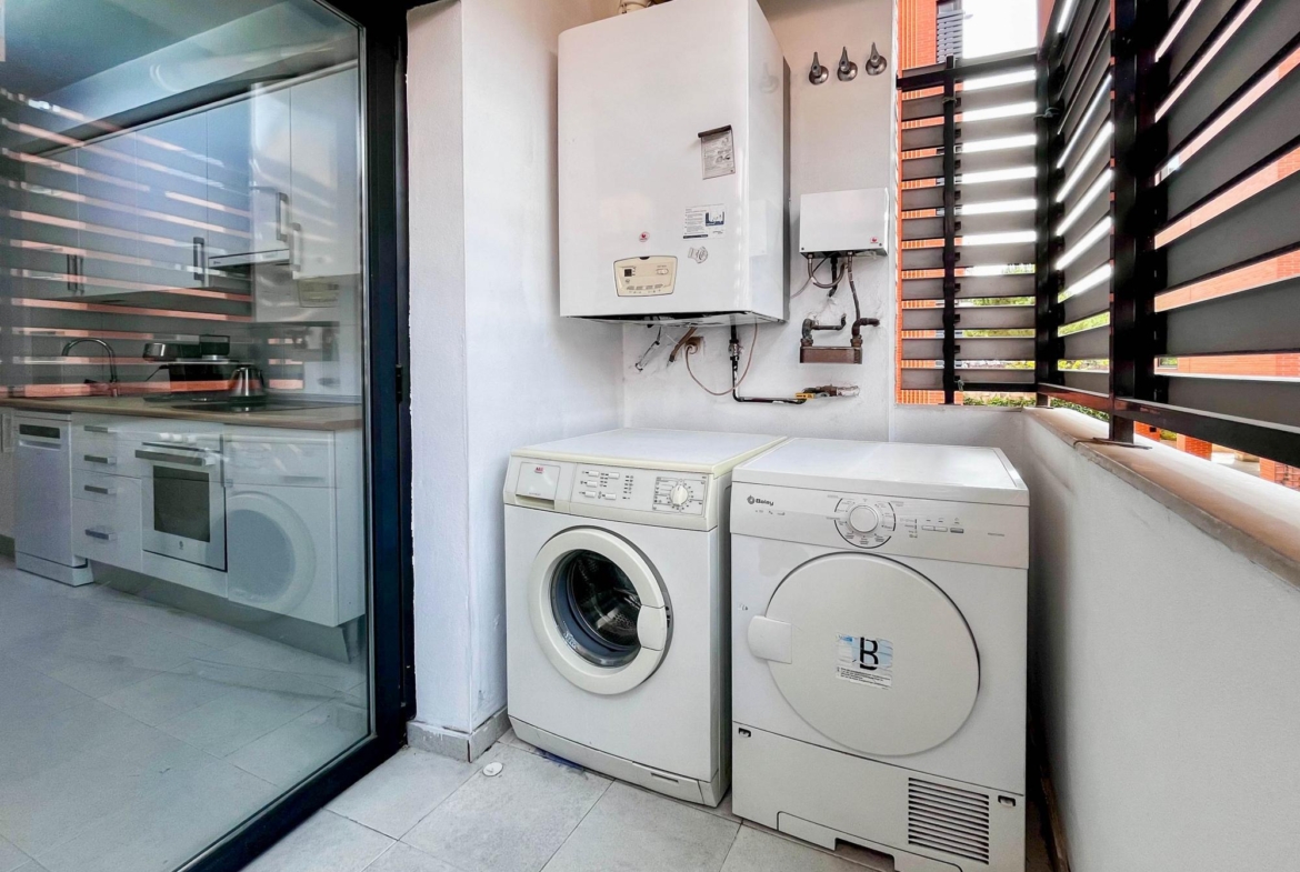 Al final de la cocina se ubica la zona de lavandería equipada con lavadora y secadora.