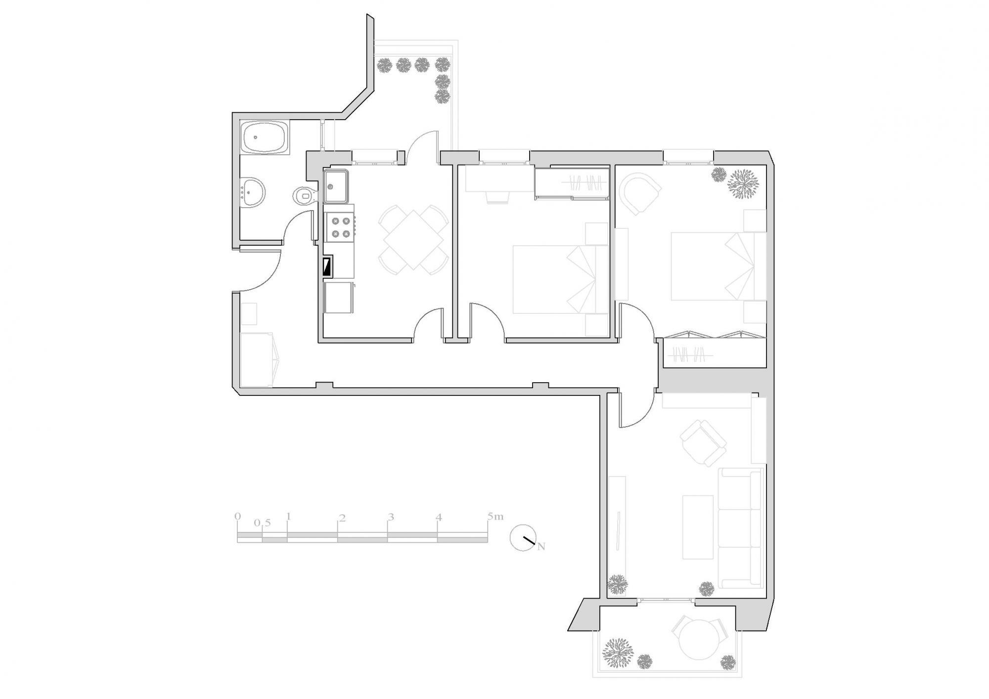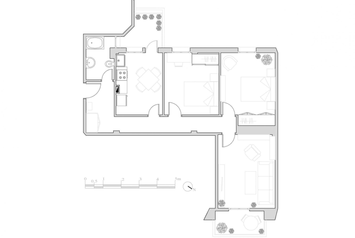 Al acceder a la vivienda, un espacioso vestíbulo da la bienvenida, desde el cual se accede al baño. Hacia el lado este se encuentra el salón con acceso a una terraza, mientras que en el lado oeste, donde predomina el sol de la tarde, están localizados los dos dormitorios, la cocina y otra amplia terraza.