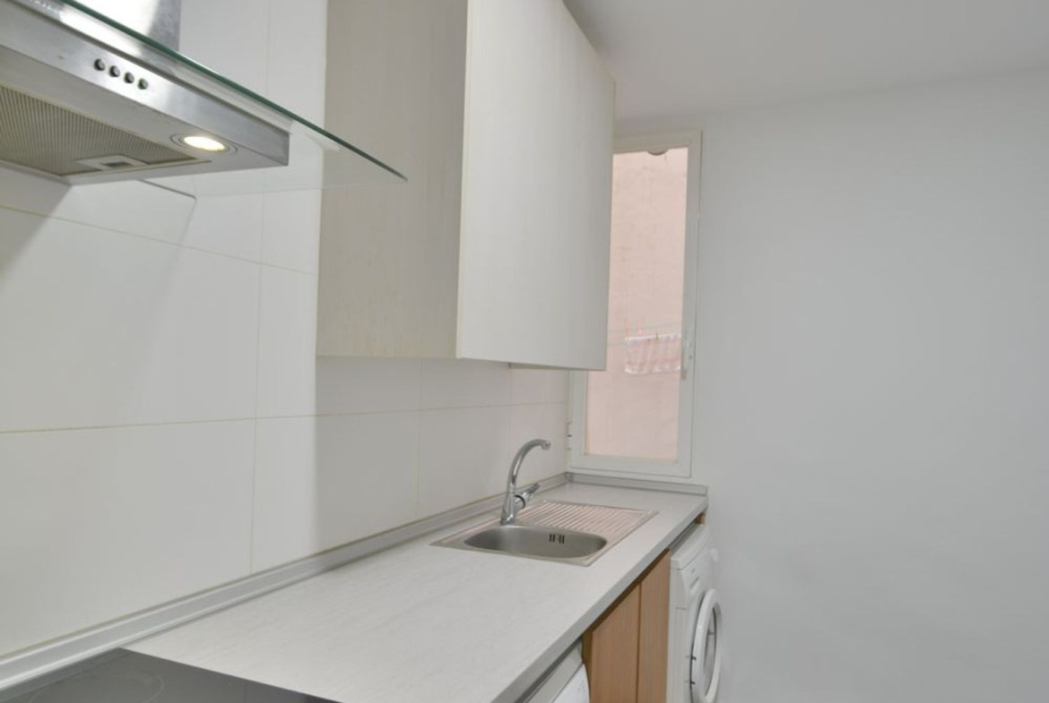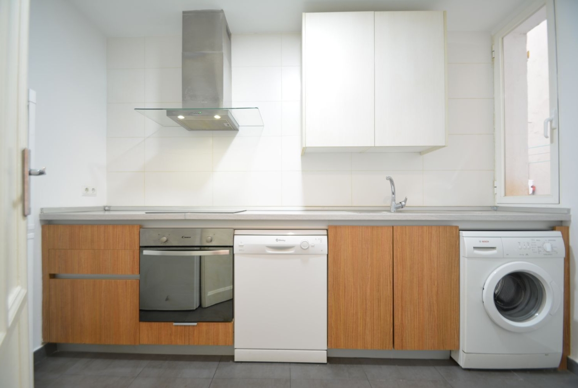 Distribución: amplio salón comedor independiente, no de paso, con 2 ventanas al patio, 2 dormitorios dobles con ventana al mismo patio de manzana, uno de ellos con gran armario empotrado, cocina independiente amueblada y equipada con todos los electrodomésticos: lavadora, lavavajillas, frigorífico, horno, vitrocerámica y campana extractora cromada; y un baño completo. Tanto la cocina como el baño disponen de ventanas de aluminio lacado blanco, dando al patio interior. Finca muy tranquila con una ubicación inmejorable, cerca de todo, pero en una pequeña calle sin ruidos, muy difícil de encontrar en el centro.
