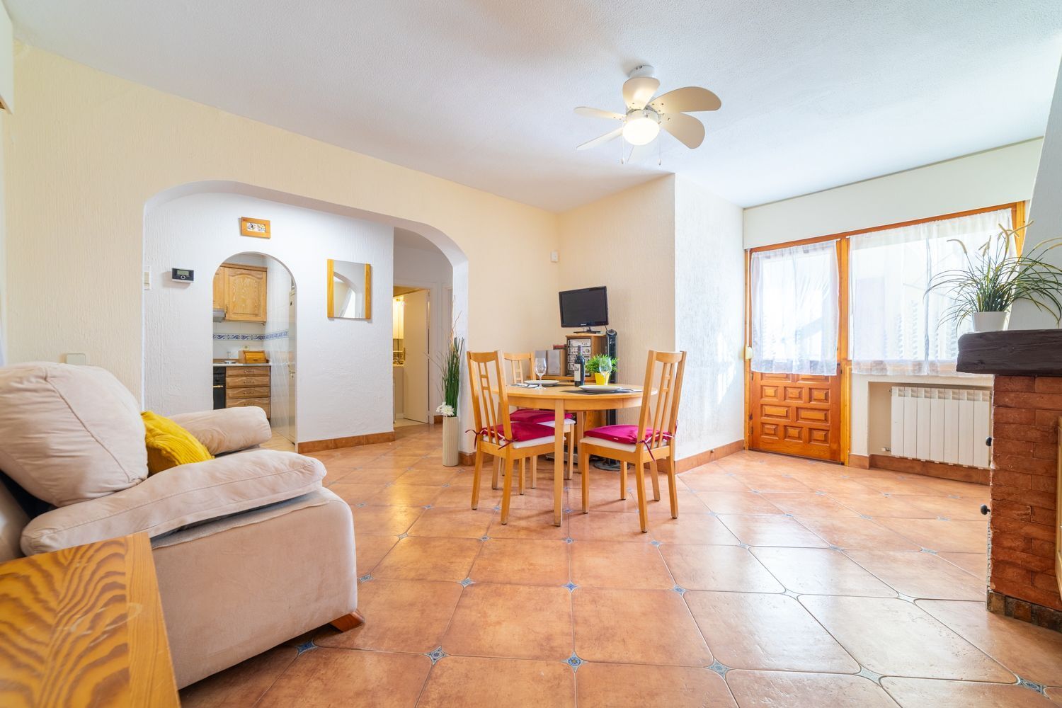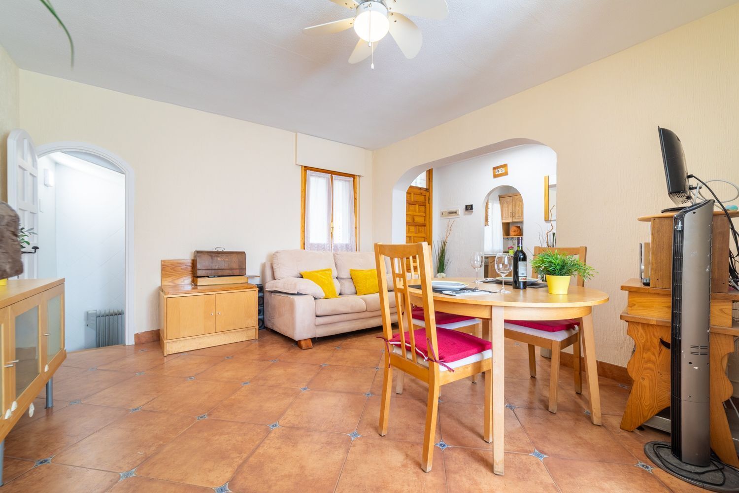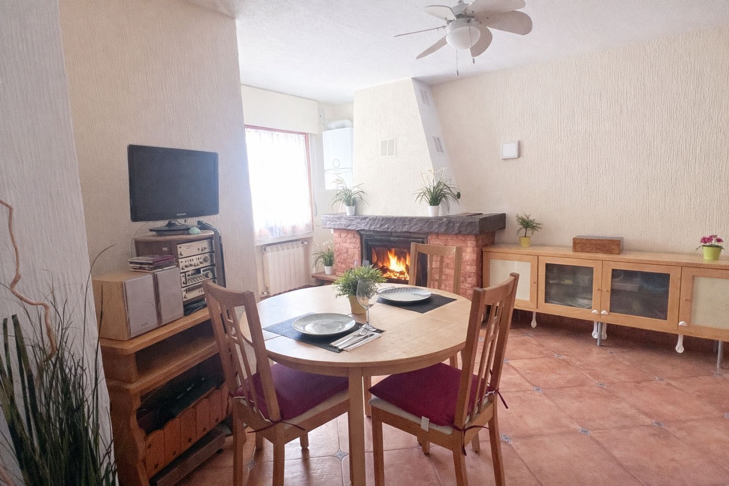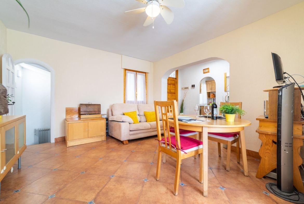 Desde el porche se accede al salón-comedor, que constituye el espacio principal de la vivienda. Cuenta con chimenea de leña, buena entrada de luz natural y salida directa a una terraza descubierta, favoreciendo la conexión entre interior y exterior.