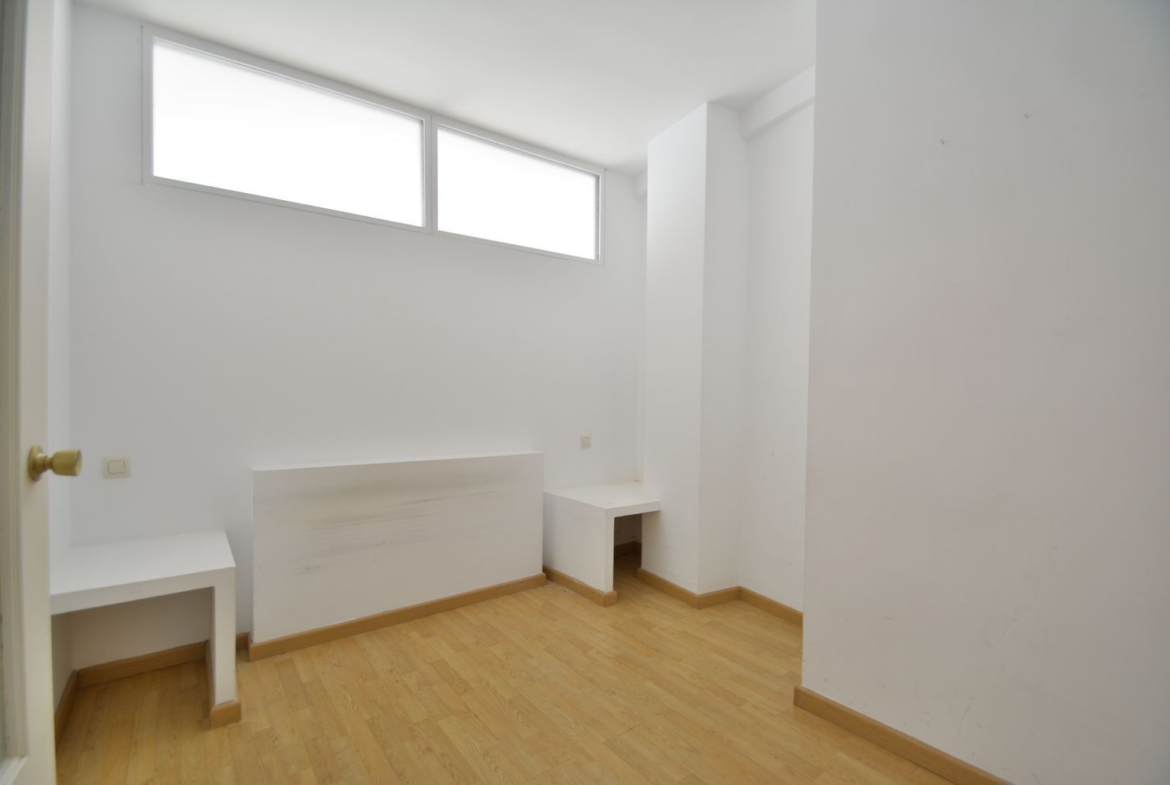 Distribución: amplio salón comedor, totalmente exterior, con 3 grandes ventanas a la calle Mayor, orientación Sur; dormitorio independiente ciego, con tabique acristalado en la parte alta tomando la luz natural procedente del salón, además de un armario empotrado de 2 hojas totalmente forrado y vestido; cocina independiente frente al hall de entrada, con frente de cocina ocultable mediante 2 grandes puertas abatibles; y cuarto de baño completo con gran ducha de obra y moderno lavabo con mueble y espejo.