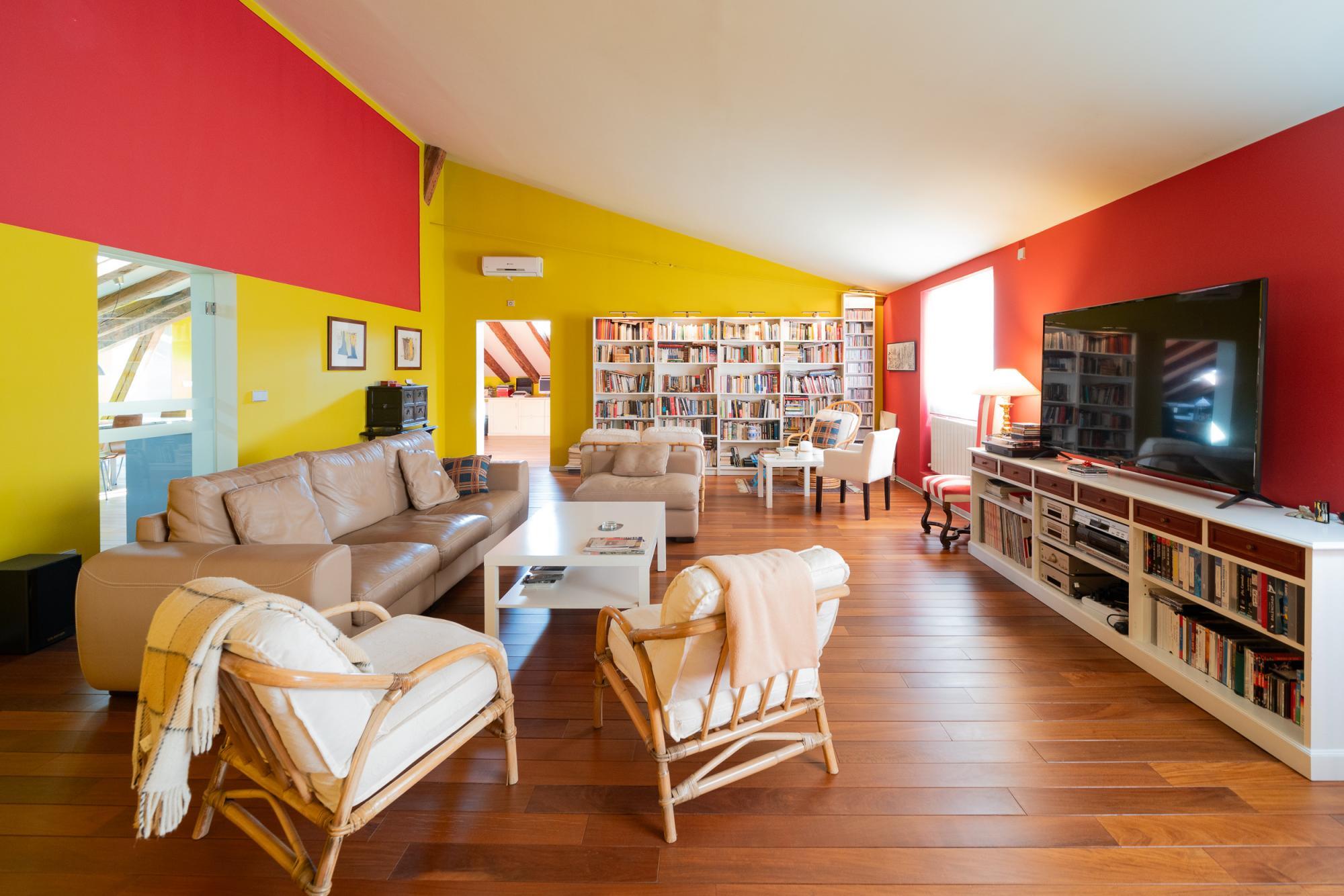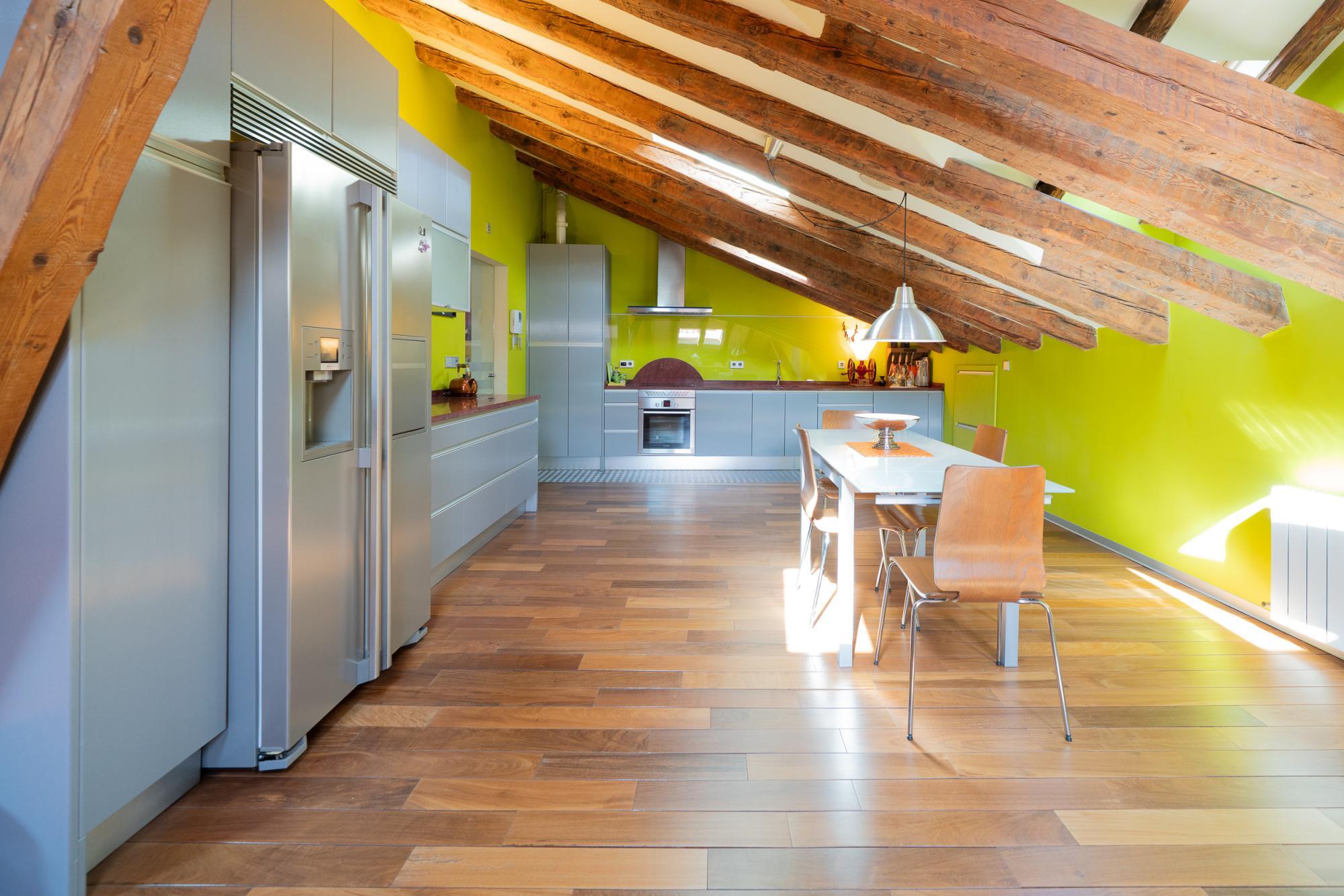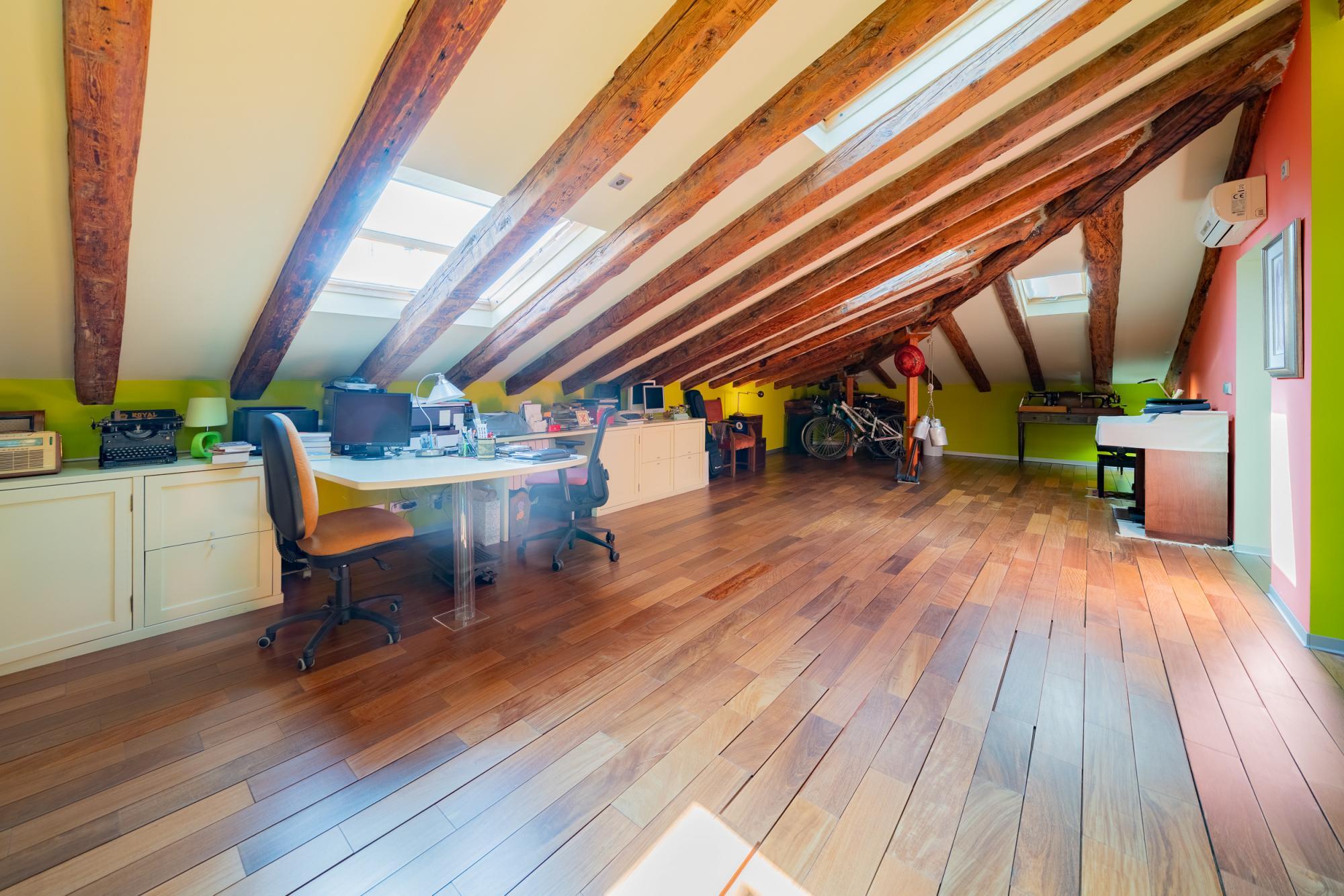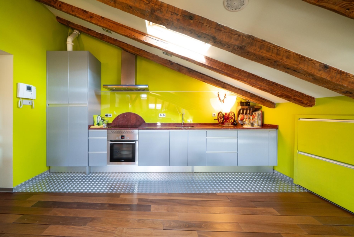 AMPLIA y exclusiva buhardilla en el centro de Madrid. Totalmente reformada, con especial atención a los aislamientos térmicos y acústicos y con un perfecto equilibrio entre el sabor de lo antiguo y los mejores materiales modernos: tarima maciza de Ipe, ventanas con Climalit y preinstalación para motorizar las persianas, cocina con encimera de granito y electrodomésticos de alta gama, ventanas tipo Velux con filtro ultravioleta, sistema para garantizar el suministro instantáneo de agua caliente en los baños, instalación de sonido y datos por toda la casa.