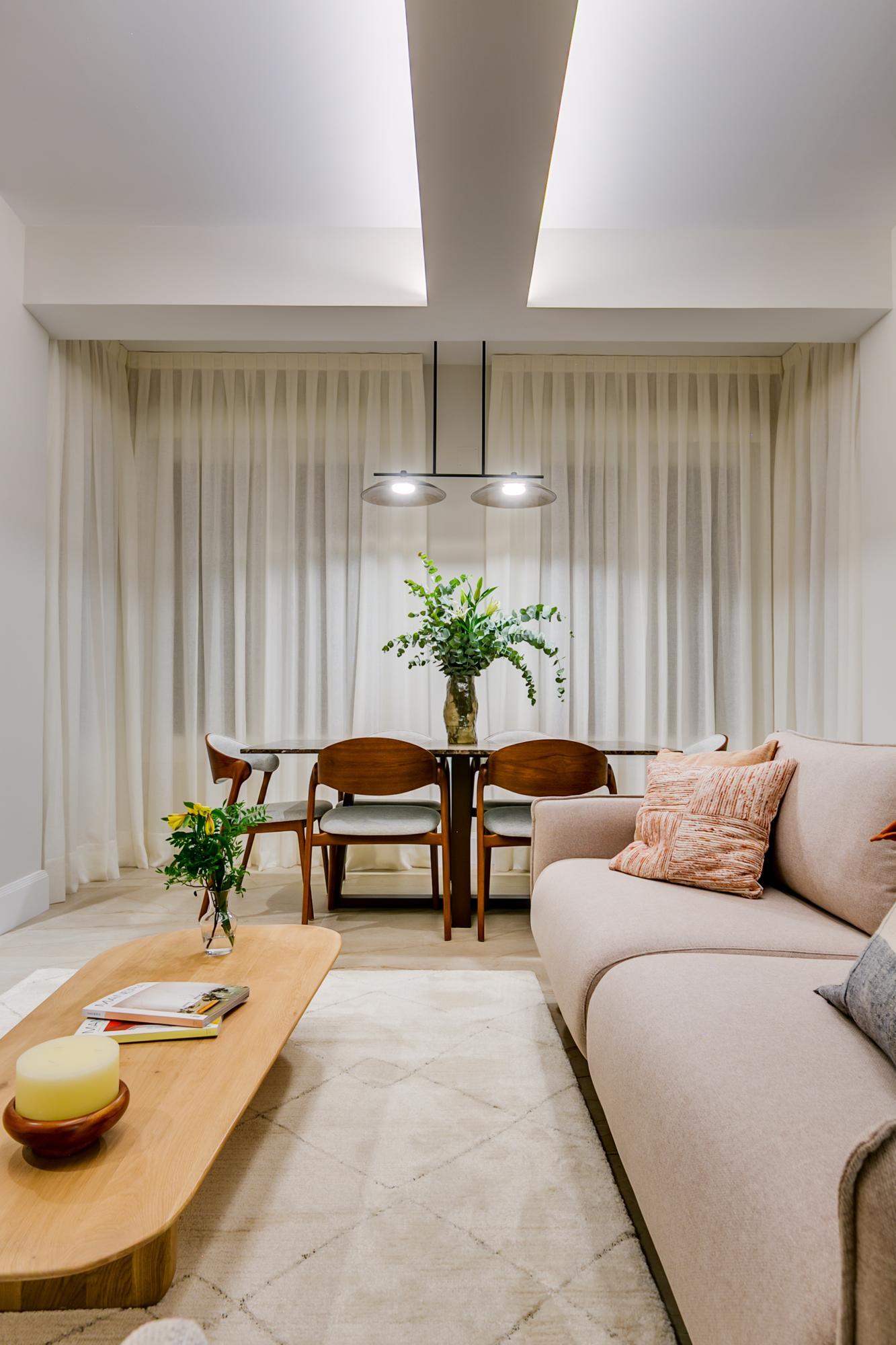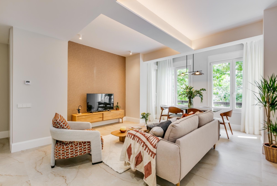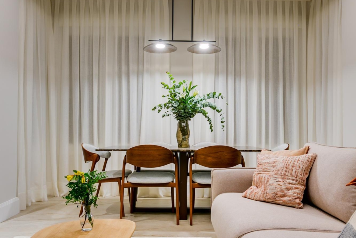 Entramos en la vivienda y nos encontramos un fantástico salón comedor con 4 ventanales a la avenida General Sánchez Ibero. La luminosidad de esta estancia es fantástica, y los árboles que vemos hacen que las ventanas sean como un cuadro verde!