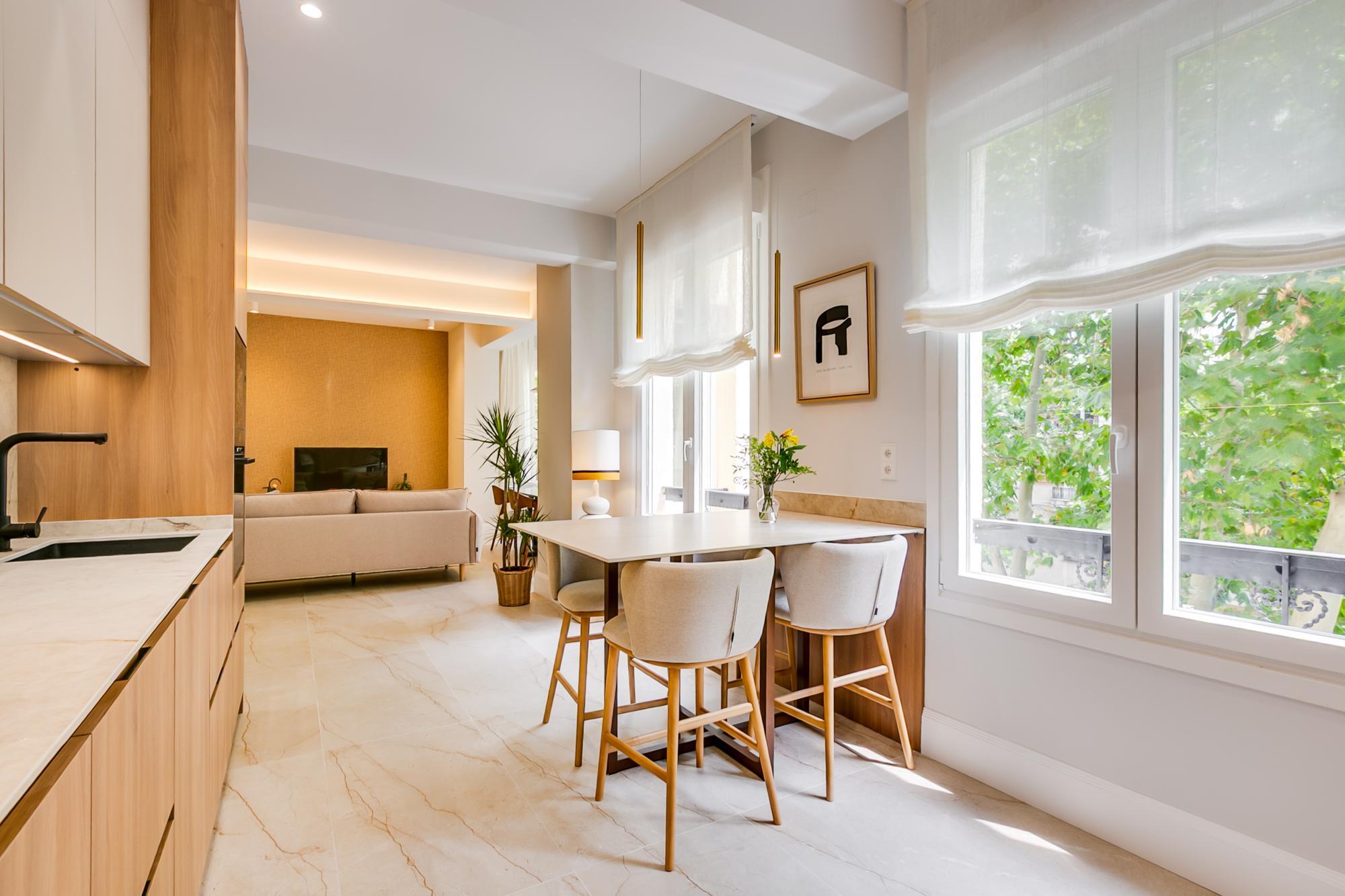 A continuación, nos espera una cocina abierta, completamente amueblada y dotada de electrodomésticos de alta gama, marca Bosch. Tiene igualmente dos grandes ventanales a la misma avenida.